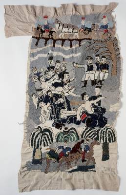 Jules Leclercq, Tourcoing (Nord), 1894 – Armentières (Nord), 1966, Bonaparte en Egypte, scène d’enlèvement, Ancien titre : Scène d’enlèvement, 1950 – 1964, œuvre textile, Broderie, fil de laine, fil de coton sur tissu de coton, 118,3 x 74 x 2,5 cm, Don de Mme Jacqueline Serret Defrance en 2005.