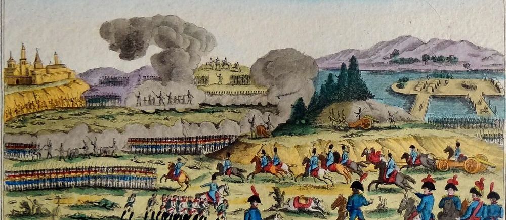 Visuel : Geneviève Chéreau, dite Veuve Chéreau (17…, 1820 ?) [éditeur], Bataille de Wagram, eau-forte rehaussée de gouache, 34,7 x 51 cm (feuille), 30,7 x 39 cm (élément imprimé), Cambrai, musée des beaux-arts, inv. n°2017.0.7